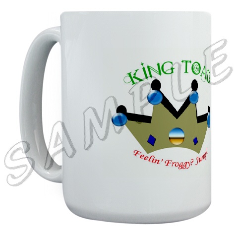 Product Number: 26111048 King Toad Large Mug 15.99 Be proud and croak "King Toad- Feelin'Froggy Jump!" with this mug. A great to show off your majesty's greatness at the pond. Super-size your favorite beverage or just size-up to avoid spills with our hefty, 15 oz. ceramic Large Mug. Large easy-grip handle. When you need more, mug it up.